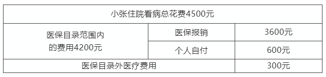 小张在医院住院看病,总花费4500元,其中纳入医保目录的医疗费用4200元,医保报销3600元,医保目录外医疗费用300元。