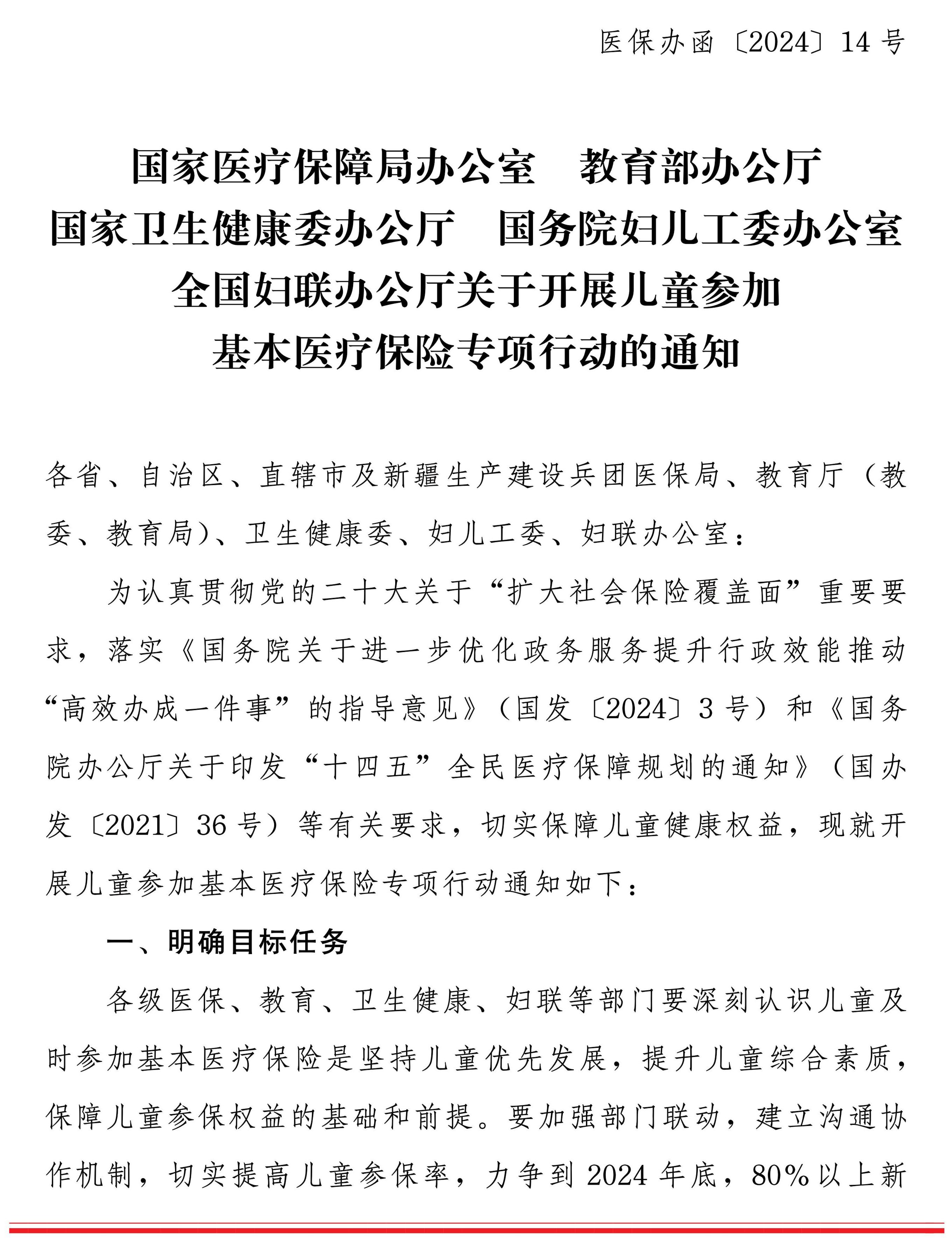 文件下载链接:国家医疗保障局办公室 教育部办公厅 国家卫生健康委办公厅 国务院妇儿工委办公室 全国妇联办公厅关于开展儿童参加基本医疗保险专项行动的通知.txt