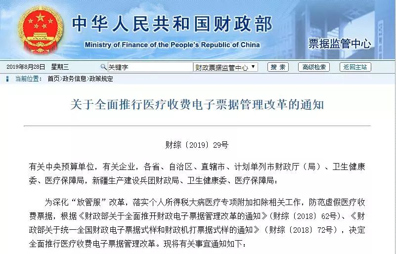 8月1日,财政部、国家卫健委、国家医保局联合发布了《关于全面推行医疗收费电子票据管理改革的通知》(财综〔2019〕29号),全面推行医疗收费电子票据改革,明确了全国统一的医疗收费电子票据式样,同时明确了电子票据信息的填列内容,对于个人所得税大病医疗专项附加扣除的政策细节进行了进一步明确。