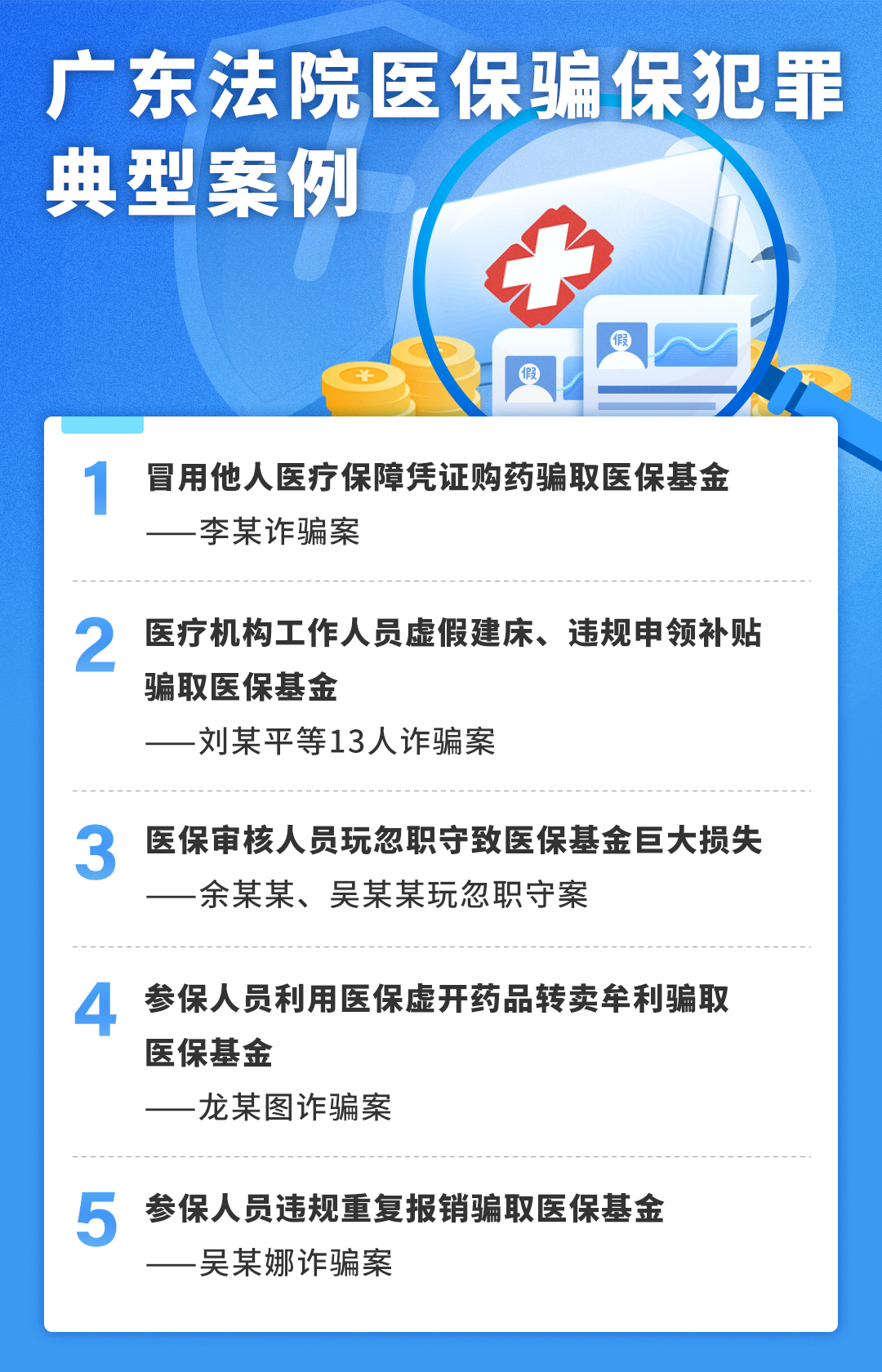 01 冒用他人医疗保障凭证购药骗取医保基金 ——李某诈骗案 基本案情 2019年6月至12月期间,李某冒用参保人肖某华(2019年5月因病死亡)的名义,到某医院就诊开药,骗取医保基金共计人民币6643.58元。案发后,李某的家属代为退缴全部违法所得。 裁判结果 法院审理认为,被告人李某以非法占有为目的,骗取居民医保基金,数额较大,其行为已构成诈骗罪。鉴于其有认罪认罚、退缴违法所得等情节,可以从轻处罚。以诈骗罪判处李某有期徒刑八个月,缓刑一年二个月,并处罚金5000元。 典型意义 参保人员在享受医疗保障待遇的同时,有义务维护医疗保障基金持续健康发展,不得冒用他人医疗保障凭证,也不得将本人医疗保障凭证交由他人冒名使用。人民法院准确适用罪名,充分考虑行为人的行为性质、危害后果、主观恶性等方面因素,坚持宽严相济刑事政策,彰显了人民法院坚决维护医保基金安全,以及对该类诈骗医保基金犯罪行为依法惩处的决心。 02 医疗机构工作人员虚假建床、违规申领补贴骗取医保基金 ——刘某平等13人诈骗案 基本案情 某中医院是一家营利性民营医疗机构和医保定点机构,刘某平是该医院的董事长和实际控制人。2017年11月起,刘某平、王某岭等人指使医院员工让享受医保待遇的参保人员免费住院,以虚开医嘱、虚构医疗项目、虚开药品、伪造病历材料等方式,向某市医保局虚假申报住院人次和医疗费用骗取医保基金。自2017年11月起至2021年3月期间,该医院介绍虚假病人入院共8100余人次,骗取国家医保基金高达2385万余元。其中,刘某平负责组织、策划、指挥医院的医护人员进行诈骗,王某岭负责对中介获利数据的审核、对医院内部人员的合谋诈骗配合行动进行管理。同案人林某龙、覃某伦、郭某军、邱某梅、邓某玲、何某、张某、潘某成、王某娣、梁某荣、植某明等11人分工负责协助刘某平实施诈骗。 裁判结果 一审法院审理认为,被告人刘某平等人结伙以非法占有为目的,采用虚构事实的方法,利用医疗保险政策,虚报医疗保险基金,骗取国家医疗保险基金,数额特别巨大,其行为均已构成诈骗罪。按各被告人在共同犯罪中的作用大小、犯罪情节、退赃退赔情况等,对被告人刘某平等人分别判处了有期徒刑十五年至三年,并处罚金,并对非法所得、犯罪物品等涉案财物依法处理。宣判后,刘某平等人提出上诉,二审法院依法维持一审判决。 典型意义 定点医疗机构应当加强行业自律,规范医药服务行为。定点医疗机构有组织团伙式作案,全链条专业化造假,骗取医保基金数额特别巨大,行为性质极其恶劣,社会危害性极大。人民法院发挥刑事审判职能作用,准确认定刑事责任,对刘某平等人判处有期徒刑十五年至三年不等刑罚,充分体现对医保定点机构骗取医保基金的行为依法严惩精神,有力维护了医疗保障制度健康持续发展。 03 医保审核人员玩忽职守致医保基金巨大损失 ——余某某、吴某某玩忽职守案 基本案情 2013年1月至2016年10月间,时任某县级市医院院长彭某某(已判刑)等人利用国家对残疾儿童医治政策,诱骗残疾人家属信任,先后对多名残疾患者通过虚开治疗次数、伪造住院治疗相关材料,虚开治疗费、药费等方式骗取医保基金。时任该县级市社保局副局长的吴某某及该局城乡居民医疗保险股股长的余某某负责复核、审核该医院每月报送的残疾儿童医疗费用报销,二人未认真执行国家医保报销文件规定,对该医院上报的相关报表、凭证等资料未认真审查即通过,亦未组织、督促对该医院进行定期或不定期的实地监督检查,对该医院出现同一群体残疾儿童长年累月、连续性住院治疗、报销的“挂床”异常情况未给予应有的关注,致使该医院骗取国家医保基金,造成国家财产巨大损失。经审计,被某县级市医院骗取的医保基金中,经吴某某审核的数据为人民币875余万元,经余某某复核的数据为人民币521余万元。 裁判结果 一审法院审理认为,吴某某、余某某身为国家机关工作人员,在工作中严重不负责任,不正确履行自己的工作职责,致使公共财产、国家和人民利益遭受重大损失,情节特别严重,以玩忽职守罪分别判处吴某某有期徒刑三年六个月、余某某有期徒刑三年。宣判后,二人提出上诉,二审法院依法维持原判。 典型意义 医保基金主管部门工作人员有义务严格核查报销材料的真实性、完整性和有效性,发现问题应及时纠正进行处理。人民法院准确区分责任,综合考虑被告人的工作职责、失职情况、量刑情节和犯罪后果依法作出判决,积极延伸审判职能作用,通过案件审理推动主管部门及时健全工作机制、堵塞漏洞,为促进医疗保障制度持续健康发展提供强有力司法服务保障。 04 参保人员利用医保虚开药品转卖牟利骗取医保基金 ——龙某图诈骗案 基本案情 龙某图于2019年2月申请了某市基本医疗保险门诊慢性、门诊特定病种(以下简称“门特”),取得门特待遇后到定点医院开药获得医保药品。2020年7月18日至2021年4月3日,龙某图在明知超量开药的情况下仍不合理从三家医院开药,共计八次转卖给蓝某某牟利,骗取医保统筹基金支付共计人民币3万余元。2021年1月23日,龙某图以另一事项骗取蓝某某1.5万元。 裁判结果 法院审理认为,被告人龙某图以非法占有为目的,诈骗公私财物,数额较大,其行为已构成诈骗罪。鉴于其具有自首、认罪认罚等情节,